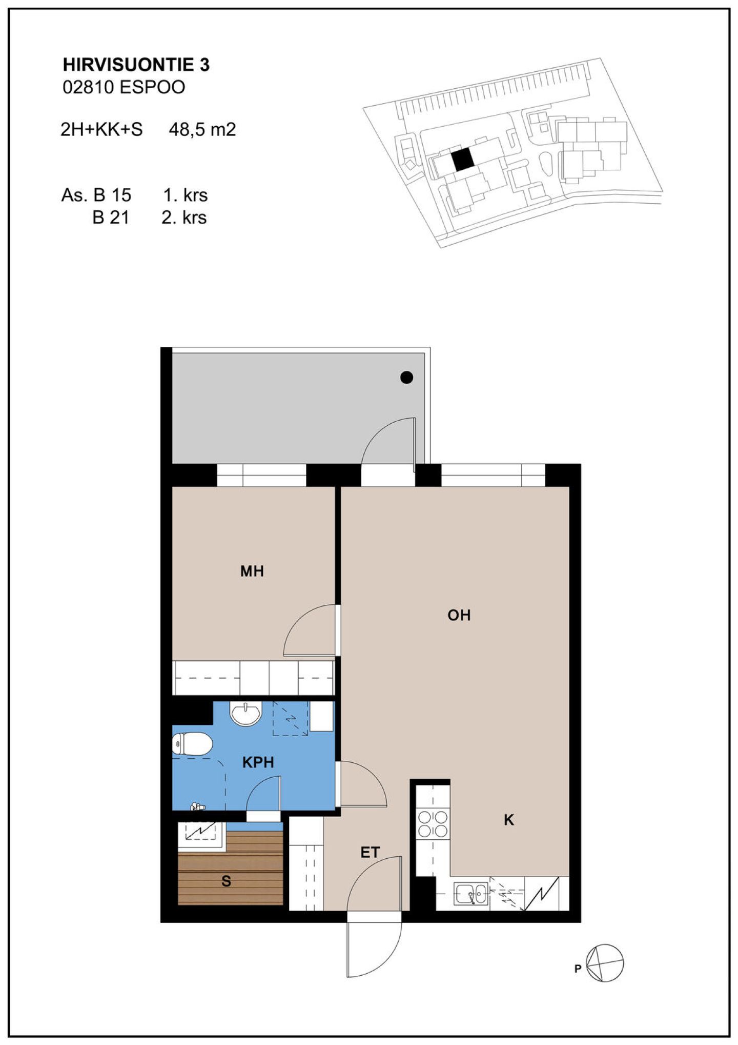 Asunnot ovat valoisia, avaria ja pohjaratkaisuiltaan toimivia. Jokaisessa asunnossa on runsaasti säilytystilaa, tilava parveke sekä oma sauna. Kohteesta löytyy asuntoja moneen eri elämäntilanteeseen, sillä asuntojakauma vaihtelee 48,5 m² kaksioista 84,5 m² neliöihin. Kohteessa ei ole hissiä.