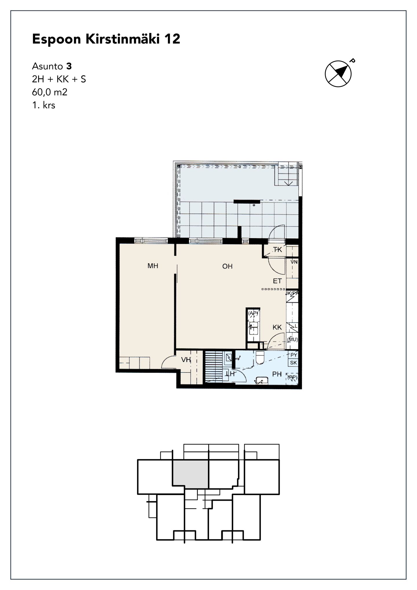Perusparannettu (2023) koti Kirstinmäestä. Tällä asunnolla on oma terassiparveke/piha, joka avautuu länteen, metsämaisemaan.