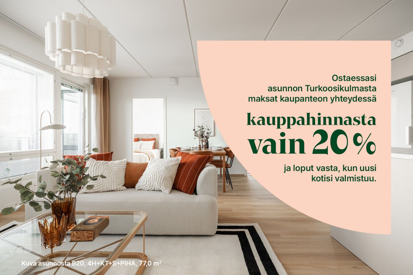 Asunto Oy Helsingin Turkoosikulmaan tulee kaikkiaan 34 viihtyisää ja valoisaa A-energialuokan kotia kokovälillä 27- 77 m2 alkovillisista yksiöistä kolmen makuuhuoneen asuntoihin. Kaikissa kodeissa on joko tilava terassi tai parveke, useimmissa 1. krs:n kodeissa on jopa ikioma asuntopiha. Turkoosikulman kodit on suunniteltu tehokkaiksi huomioiden erityisesti säilytystilantarve. Tavallista korkeammat ikkunat tuovat koteihin valoa ja ilmavuutta. Lattialämmitys taas on miellyttävä ja taloudellinen lämmitysratkaisu helpottaen myös sisustamista. Suuremmissa kolmioissa ja kaikissa neliöissä on oma sauna. Taloyhtiön kattavat yhteiskäyttötilat kuten talosauna, pesula ja kuivaushuone helpottavat kaikkien asukkaiden arkea.