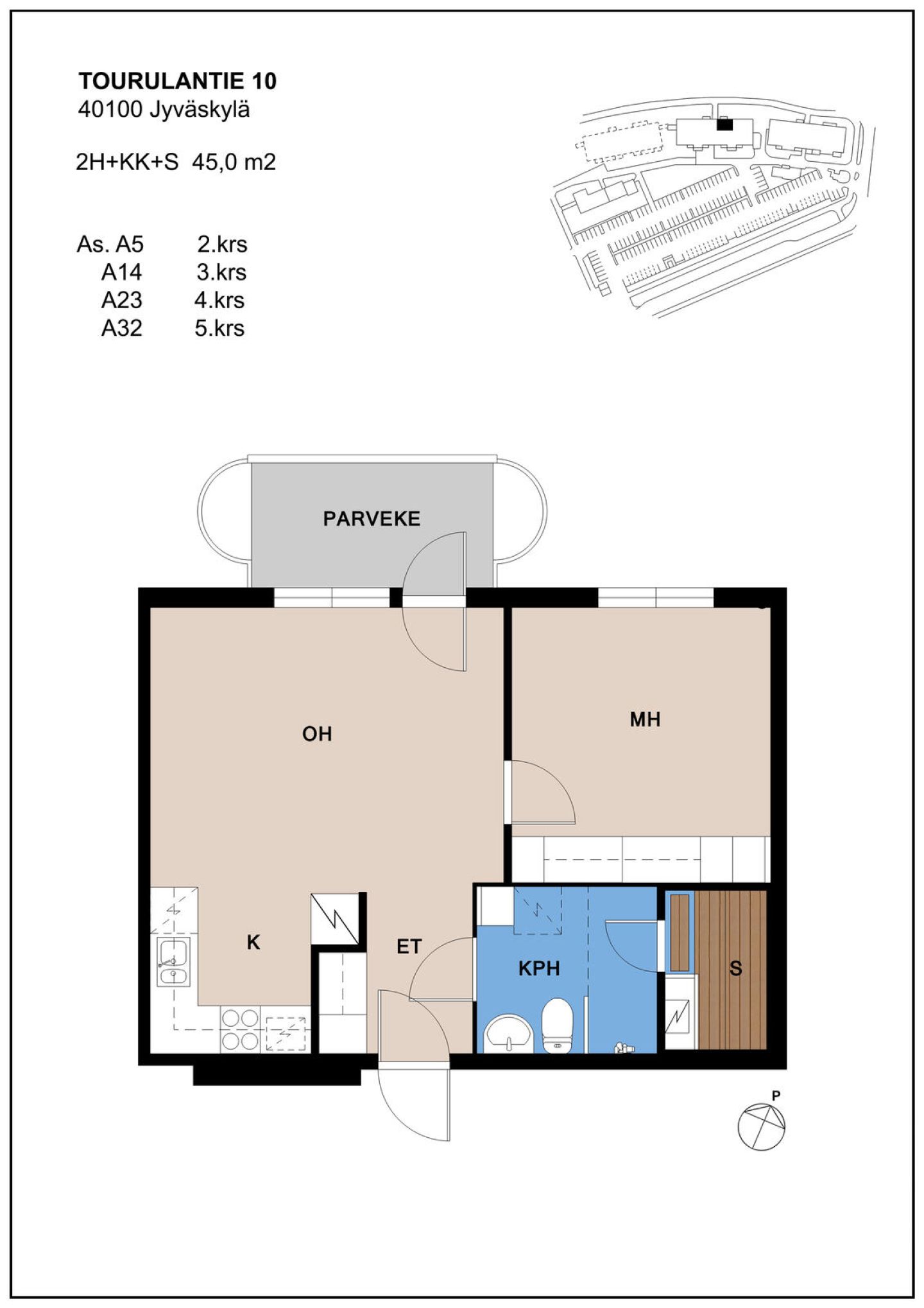 Tässä v. 2006 valmistuneessa kohteessa on yhteensä 40 toimivapohjaista saunallista huoneistoa, joiden koot vaihtelevat 36,5 m² yksiöstä 64 m² kolmioihin. Kaikissa huoneistoissa on parveke tai terassi (maantaso kerros). Huoneistoissa on myös vesikiertoinen lattialämmitys, joten patterit eivät haittaa sisustamista.