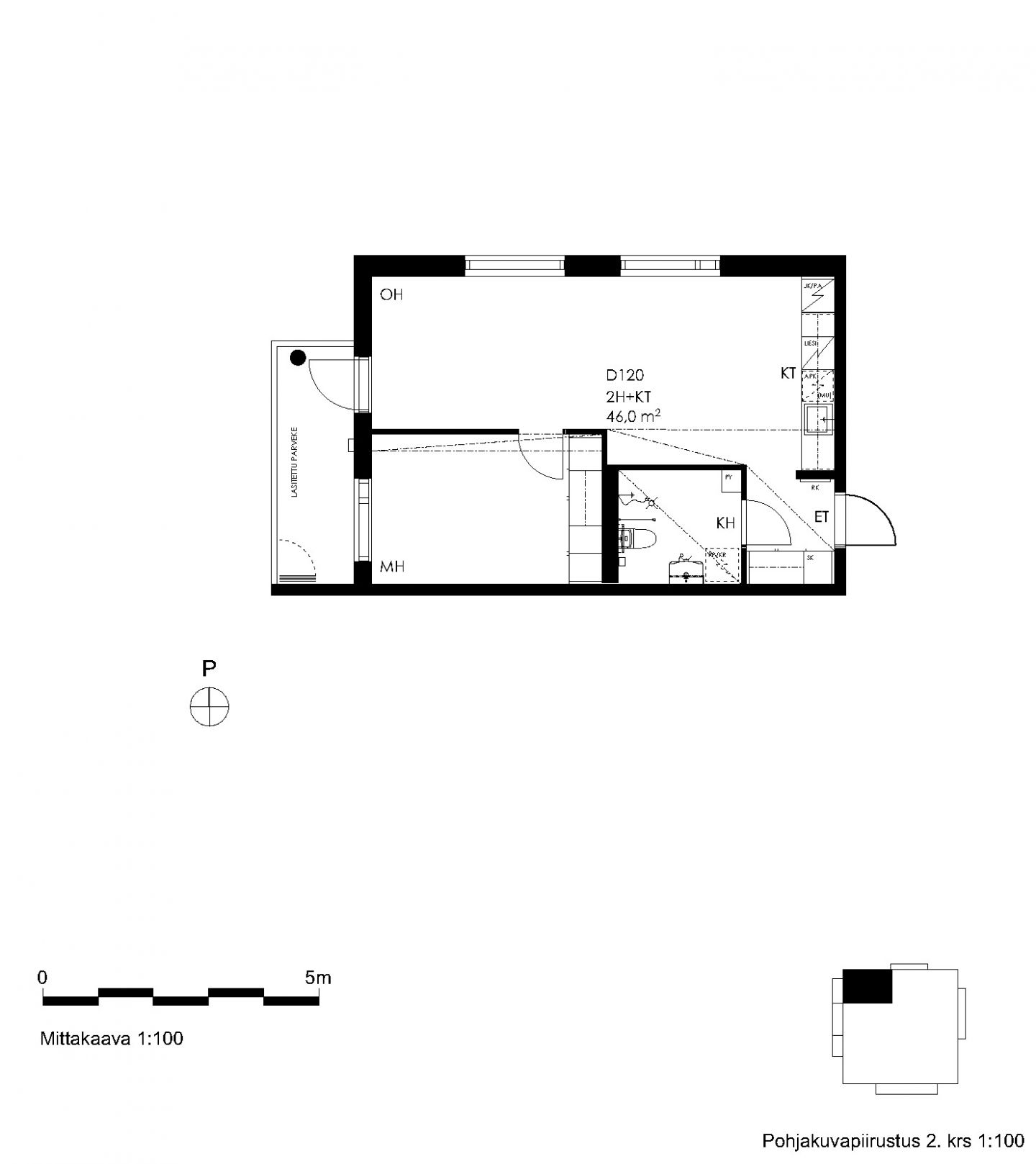 Toisen kerroksen kaksio, jossa lasitettu parveke.