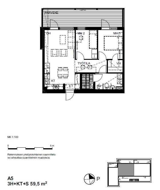 Luhtitalon toisen kerroksen asunto, lasitettu parveke.