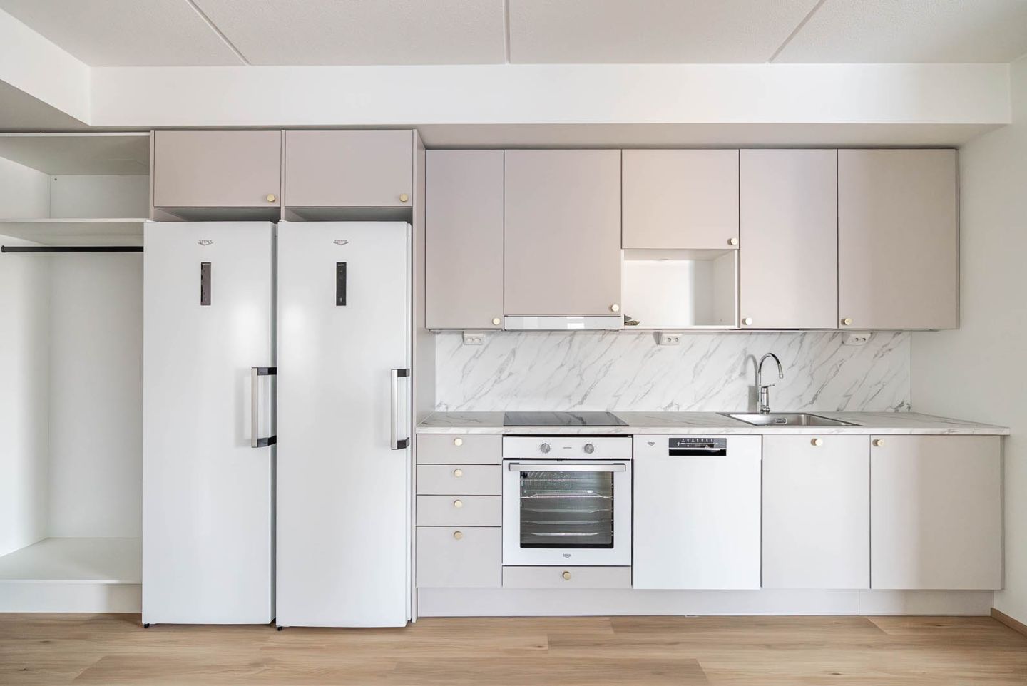 | Keittiön varusteet | Puustellin laadukkaat kalusteet. Induktioliesitaso, kalusteuuni, astianpesukone, täyskorkeat jää- ja pakastinkaappi |