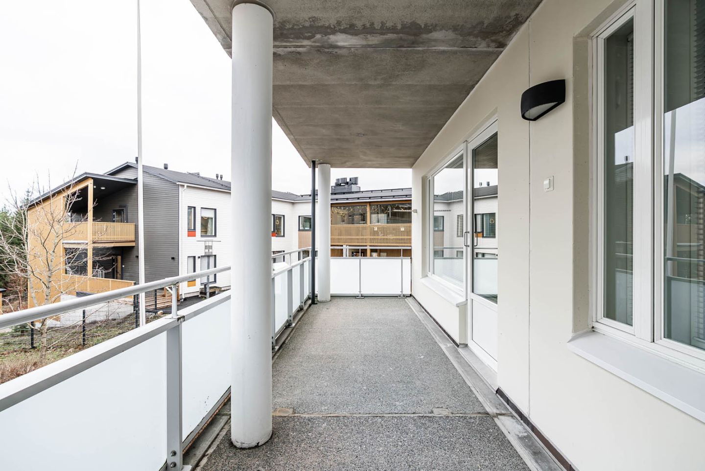 Toisen kerroksen kulma-asunto, jossa iso olo- ja makuuhuoneen pituinen parveke.