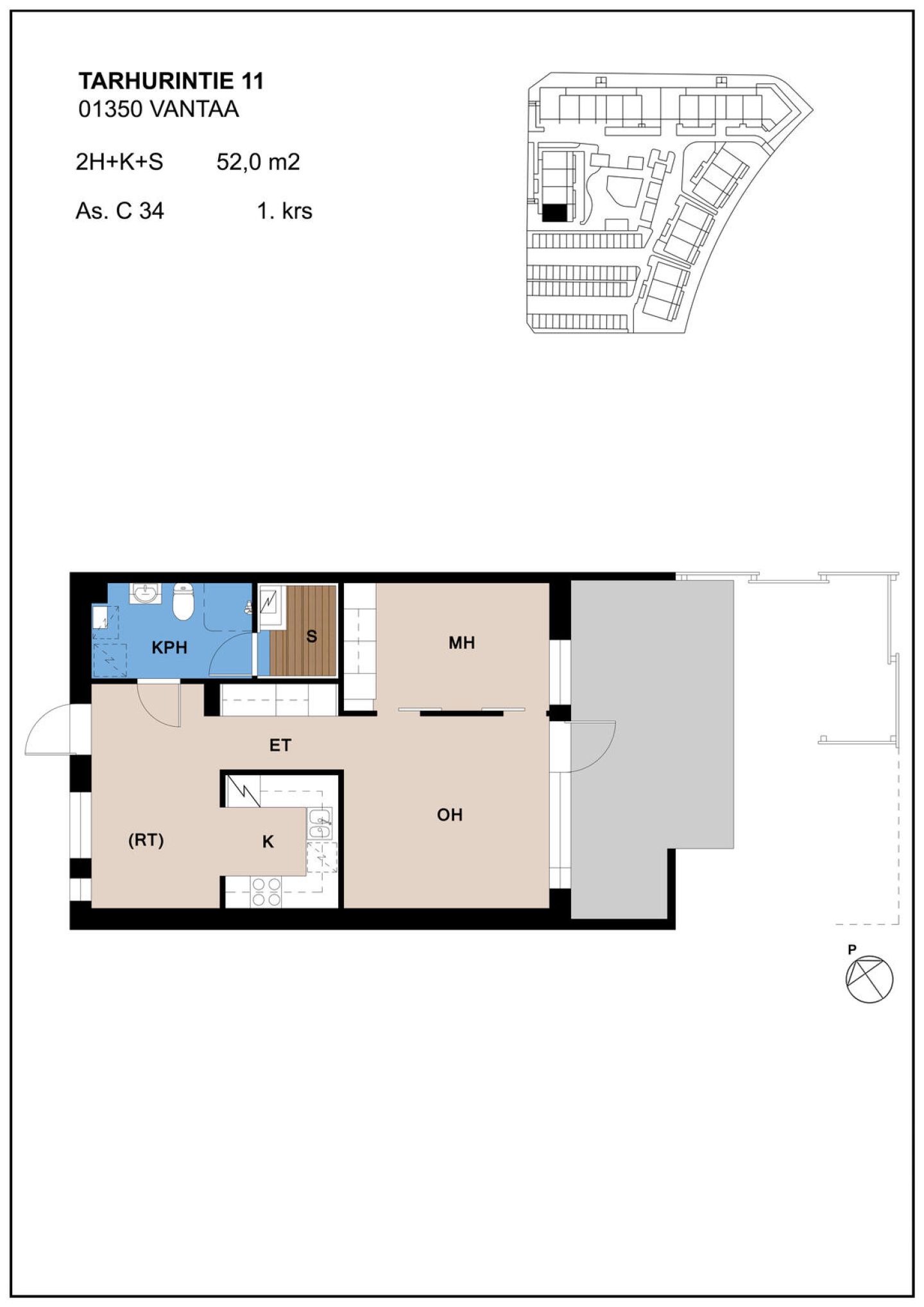 Päätyasunto, jossa lasitettu terassi ja pieni piha itä-eteläsuuntaan.