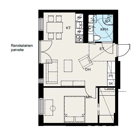 Alimman kerroksen kaksio, jossa ranskalainen parveke.