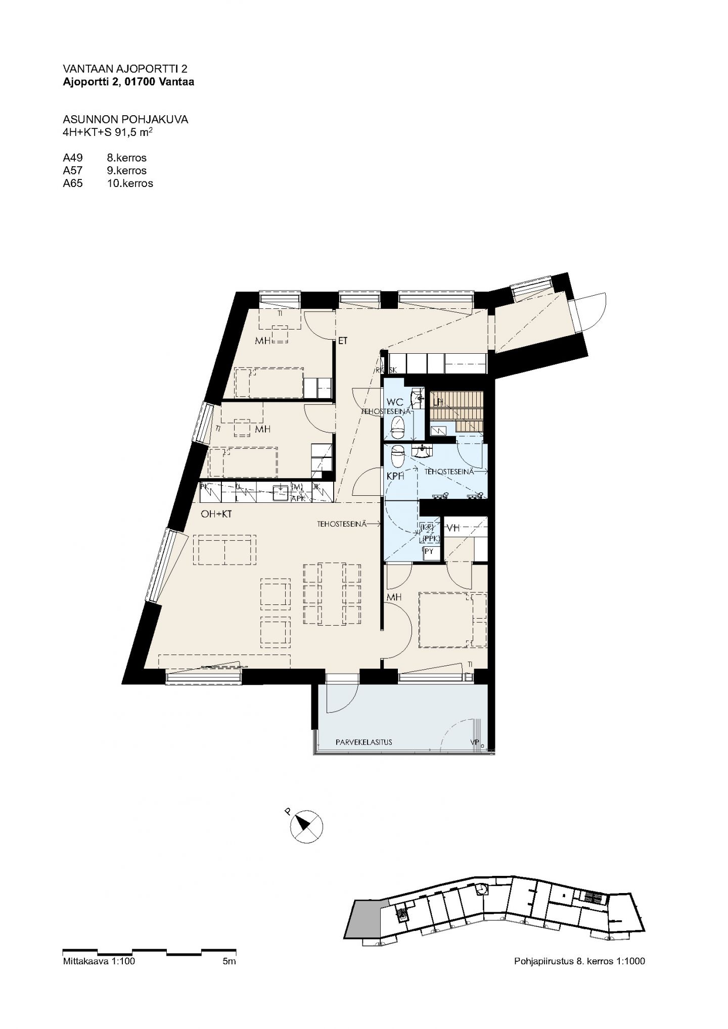 Ylimmän 10. kerroksen läpitalon huoneisto.