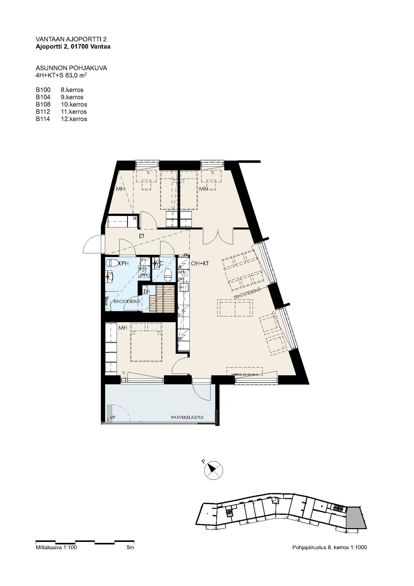 Valoisa kahdeksannen kerroksen päätyhuoneisto.