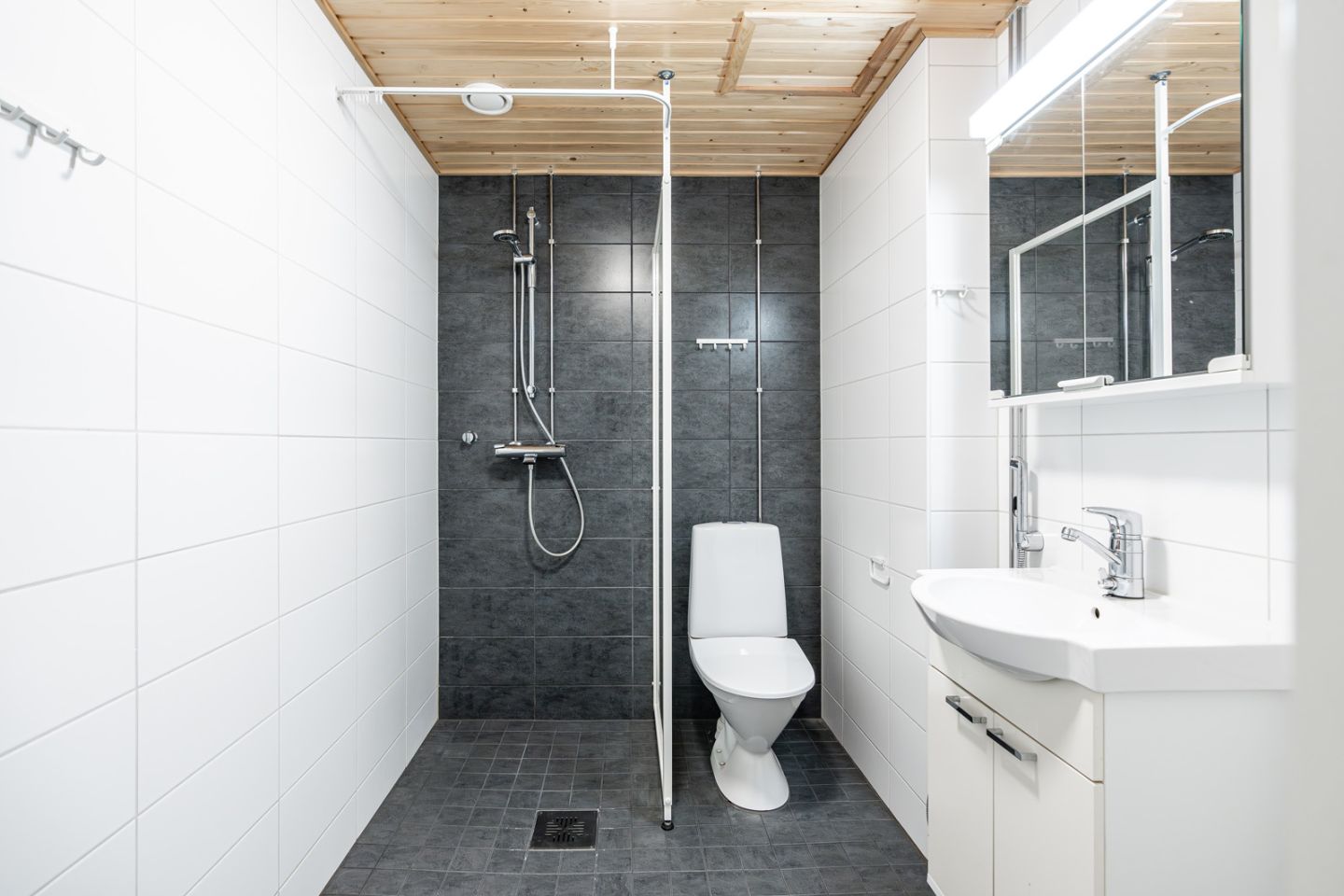 Tämä Martinlaakson polulle päin avautuva yksiö tarjoaa siistin kokonaisuuden, jossa suuri ikkuna ja ranskalainen parveke tuovat avaruutta oleskelutilaan. Keittiössä on harmaat kaapistot, valkoinen laatoitettu välitila ja kattava varustelu: induktioliesi, mikroaaltouuni, astianpesukone ja jää‑pakastinkaappi. Vaalea laminaattilattia tekee tiloista yhtenäiset ja helposti sisustettavat.